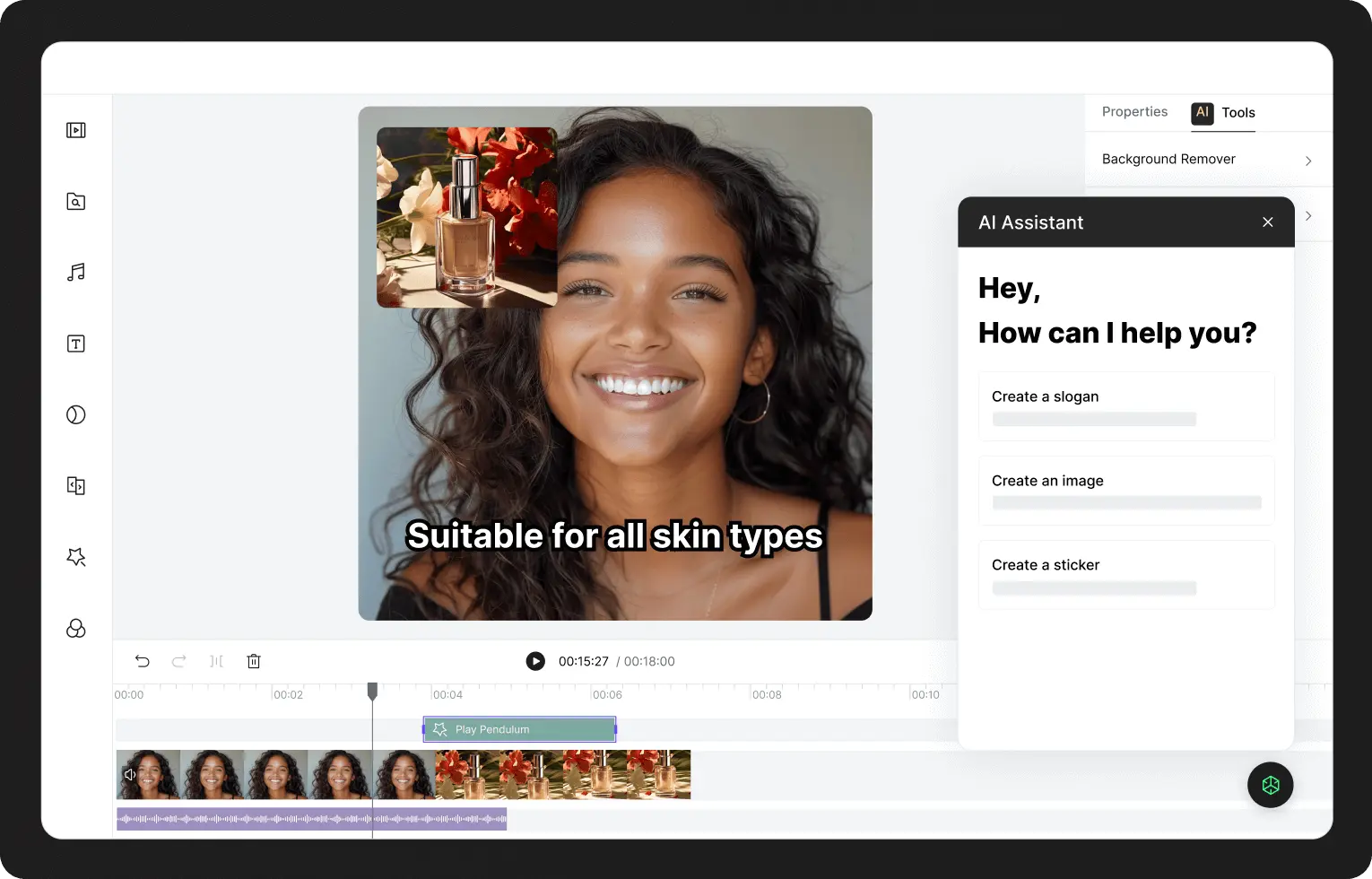 Whether you're starting from scratch or fine-tuning your footage, AI assistant helps you generate scripts, images, and stickers — and instantly edit content with tools like background removal, object erasing, and image enhancement. Everything you need, all in one place.