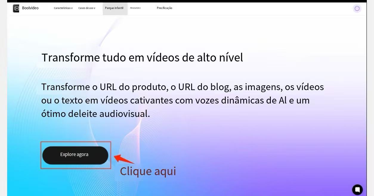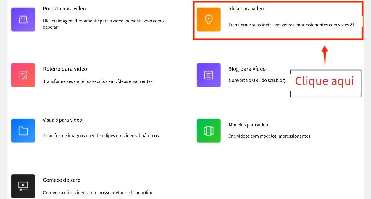 Na página inicial, clique em 'Explorar agora' para entrar na página principal e selecione 'Ideia para vídeo'.