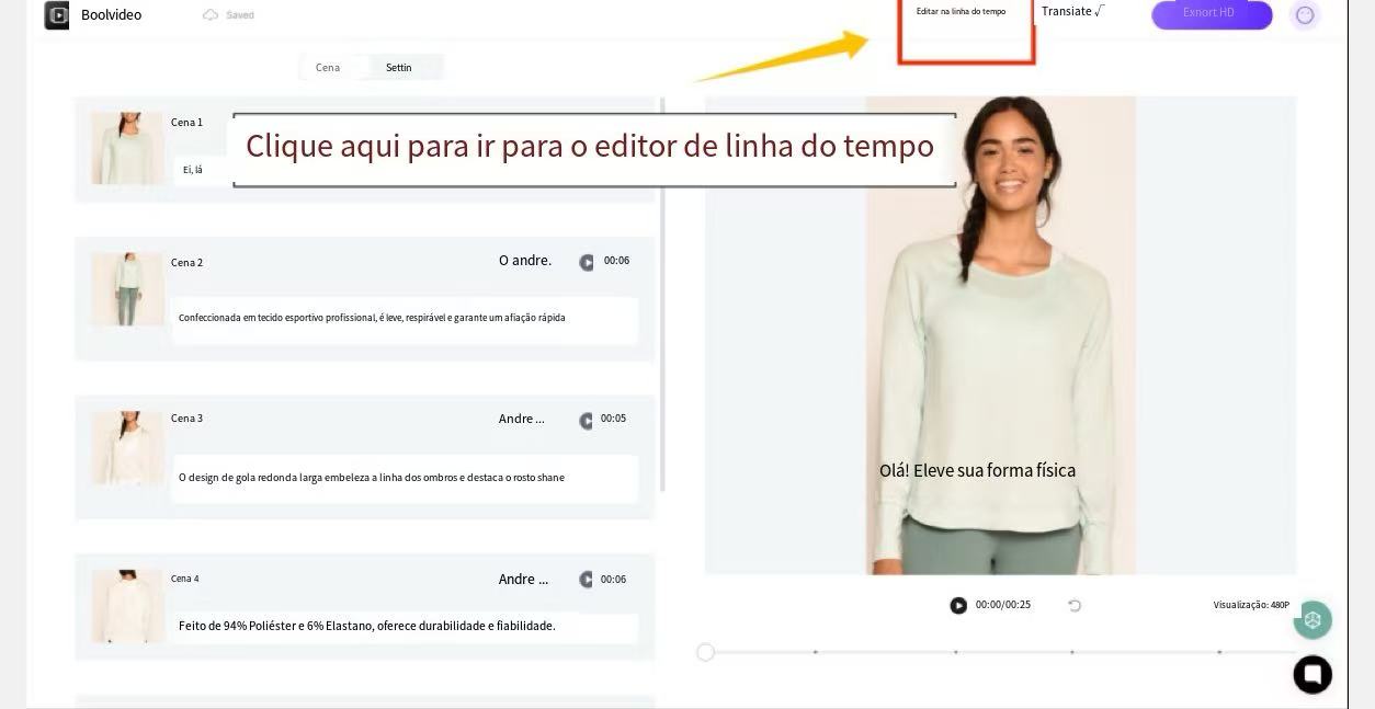 Aguarde um momento e os clipes gerados serão exibidos no editor de cena. Você pode editar o vídeo, alterar o idioma e escolher o nome e a resolução do vídeo na exportação. Para tutoriais de edição específicos, consulte nosso outro artigo: Como editar vídeo no Editor de Cena.