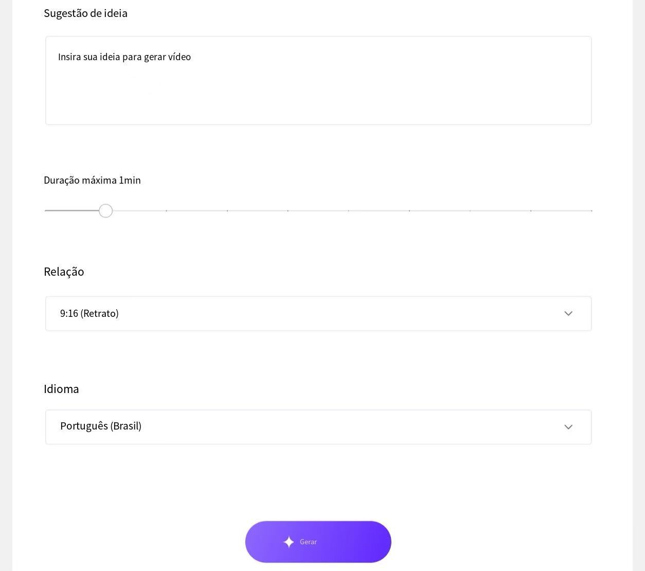 De acordo com as instruções, insira sua ideia, defina a duração do vídeo, a proporção e o idioma e clique em 'Gerar' para criar o vídeo.